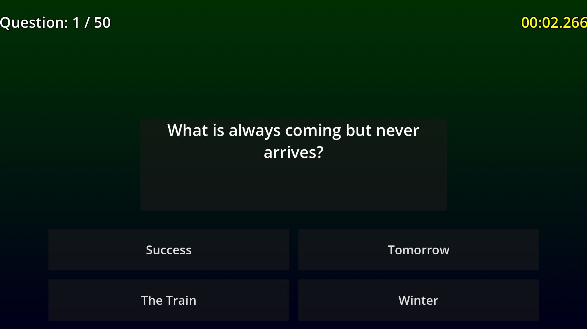 - 🧠 The Gauntlet: You must answer 50 riddles consecutively to see the Victory Screen. One mistake sends you back to the start.